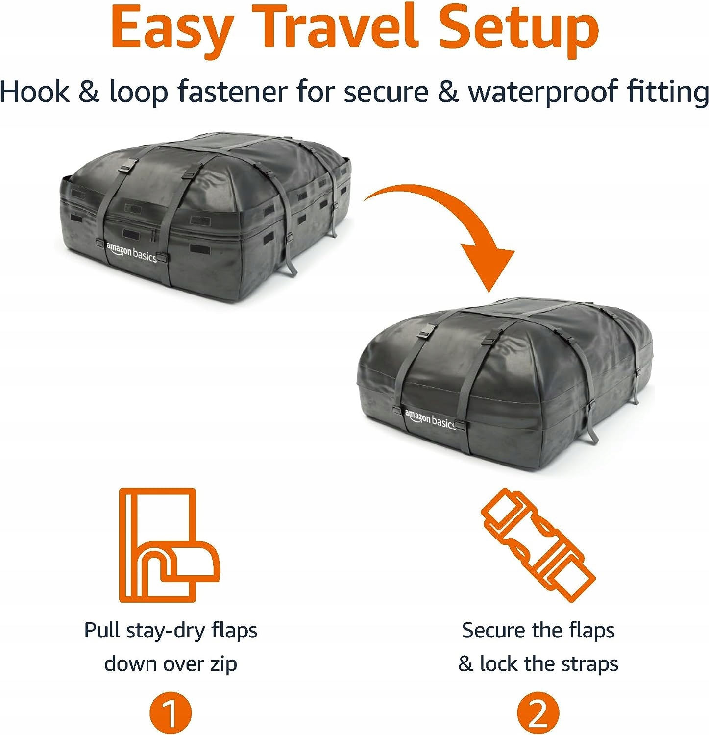 Миттєво збільште простір для зберігання за допомогою чорної сумки AmazonBasics для багажника на даху 425 л. Місткий розмір сумки ідеально підходить для сімейних подорожей і поїздки на вихідні, пригоди або день у русі. Це збільшує загальну вантажопідйомність вашого автомобіля та полегшує взяти з собою все необхідне. Зберігання речей на даху забезпечує більше місця у вашому автомобілі та комфортнішу подорож.