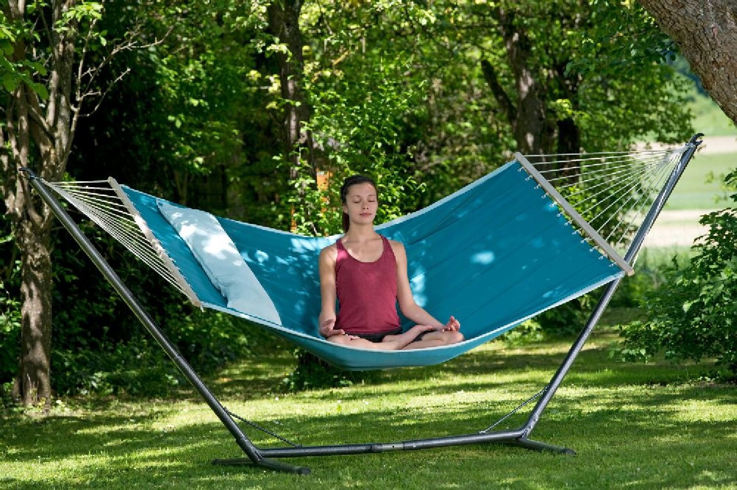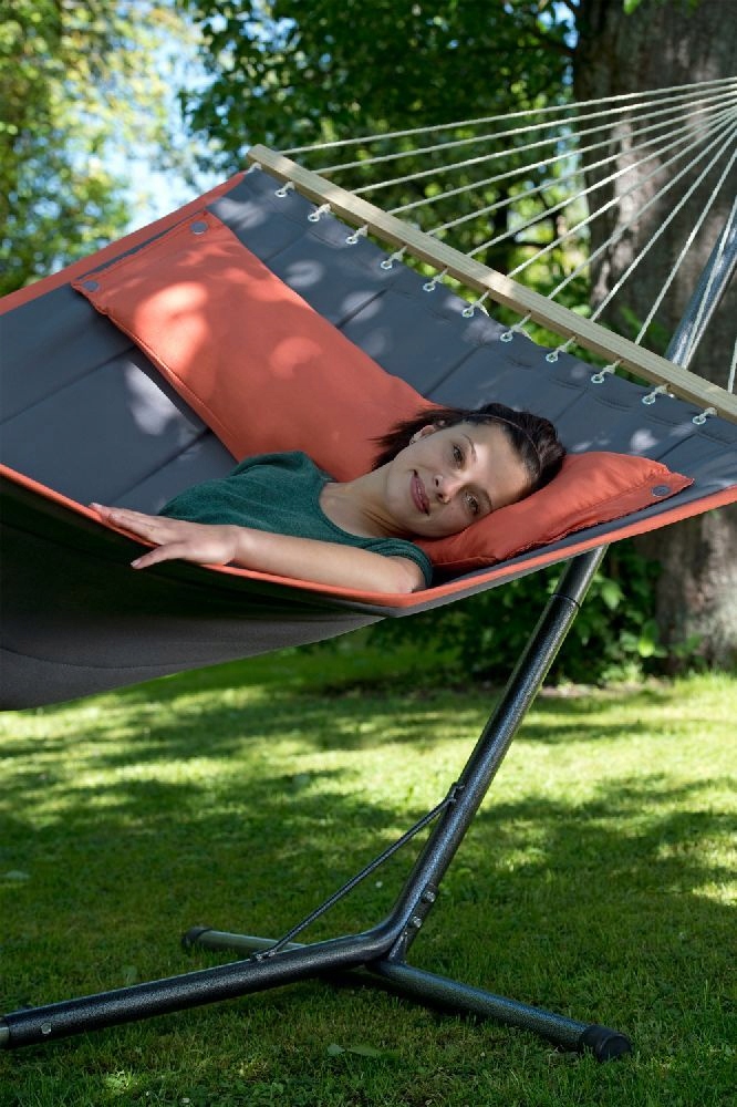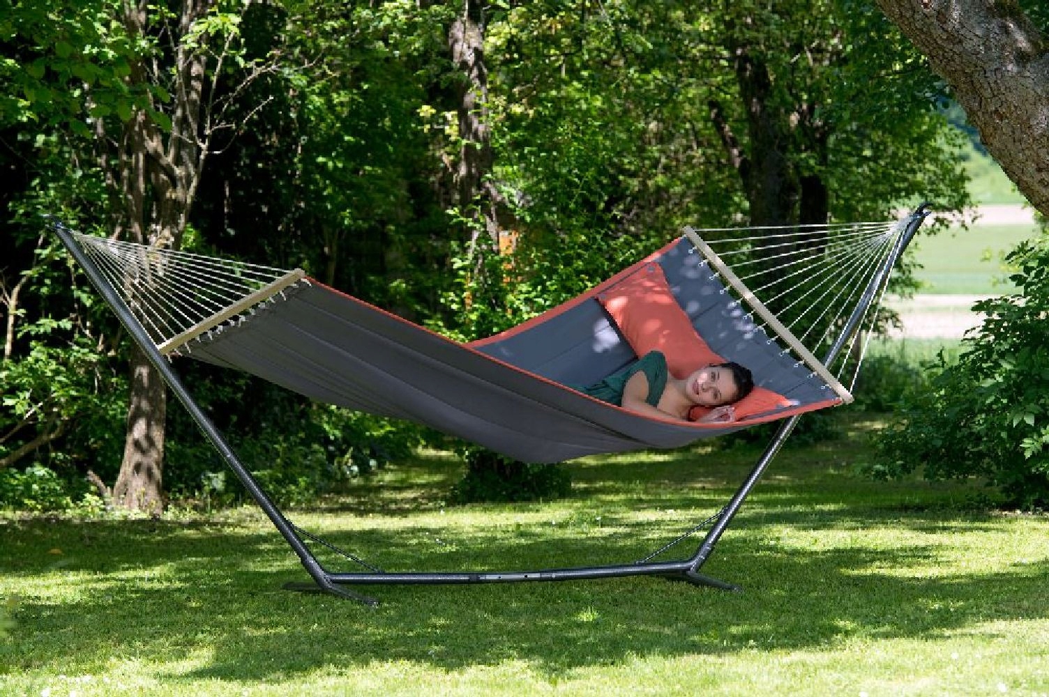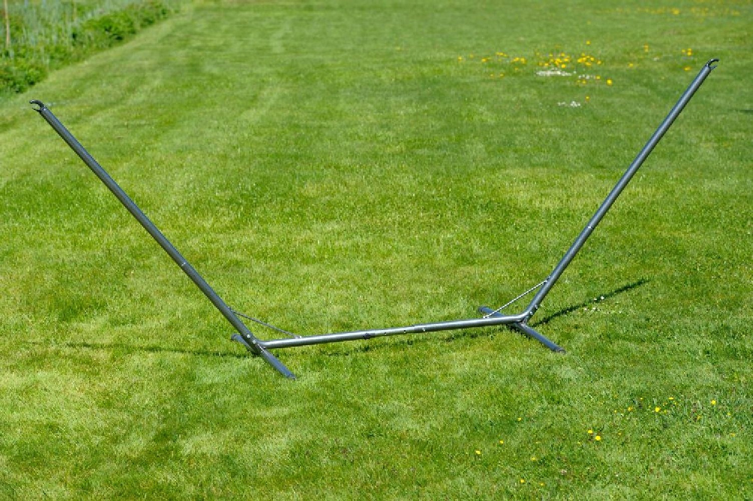 вражаюче велика металева гамака. Ідеально підходить для гамаків 330-360 см. Це легко встановити, його розподіл та регулювання не потребують додаткових інструментів. Після складання він займає мало місця. Скрема -стійкий матеріал.