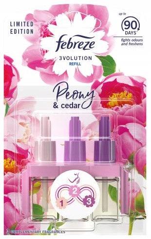 Освіжувач повітря Febreze 3Volution Peony & Cedar постійно бореться з неприємними запахами та перемикається між 3 додатковими ароматами для свіжості, яку ви постійно відчуваєте. Триває до 90 днів (використання 12 годин на день на низьких налаштуваннях). Відкрийте для себе красу півонії та кедра завдяки посиленому аромату, який поширюється далі, наповнюючи кімнату ароматом.