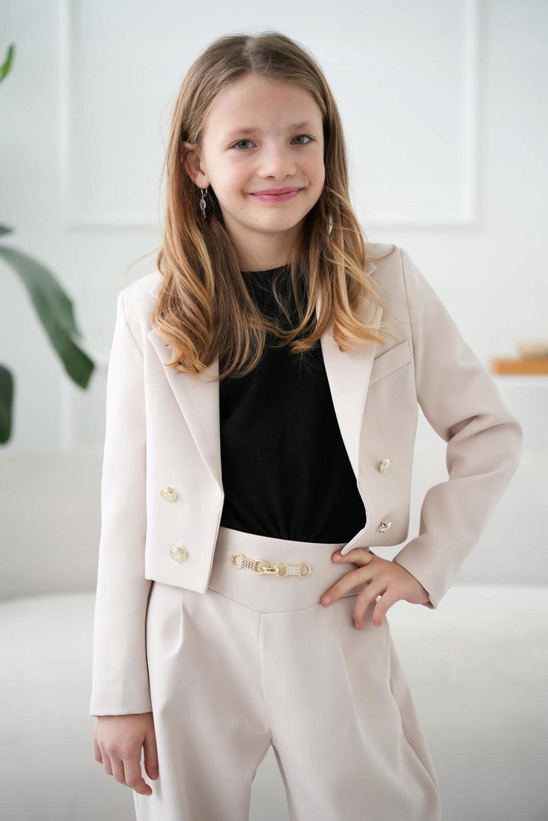 Бежевий колір надає куртці дівочого, класичного та універсального персонажа. Beige - це відтінок, який легко поєднується з іншими кольорами, що робить куртку універсальним елементом гардеробу. Довгий рукав робить куртку придатною для більш прохолодних днів, додавши дівочу стильність елегантності та тепла. Золоті кнопки додають дівочого персонажа до піджака. Комір додає витонченість до піджака і підкреслює шию. Він може мати різні форми, від класичного коміра до більш декоративних варіантів. Така куртка буде ідеальною для більш офіційних результатів або особливих випадків, додавання дівочої гардеробної елегантності та стилю. Ширина 42 см