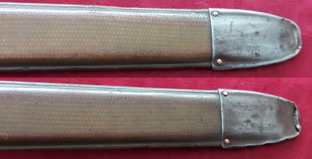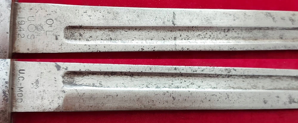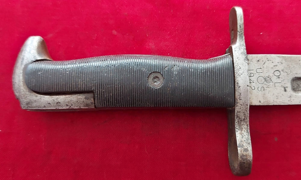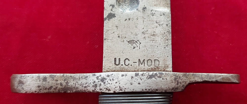 Копія, видна на фотографіях. Добре збережено. Лезо в епоху коротких і загострених. На порізі, в основному, рідко підписуючи обмежені рослини Oneida - букви ol . Нижче наведено вибуховий темно -синій між буквами us та роком виробництва 1942 . З іншого боку, розмитий підпис та U.C. - Мод . Обшивка ручки оригінальна, виготовлена з пластику. Замок Bayonet функціональний.