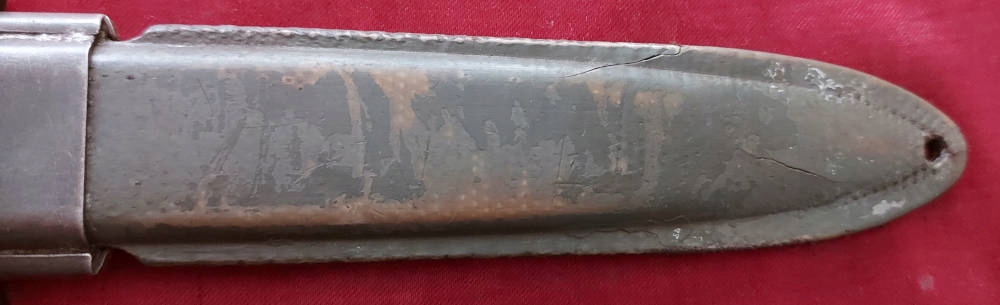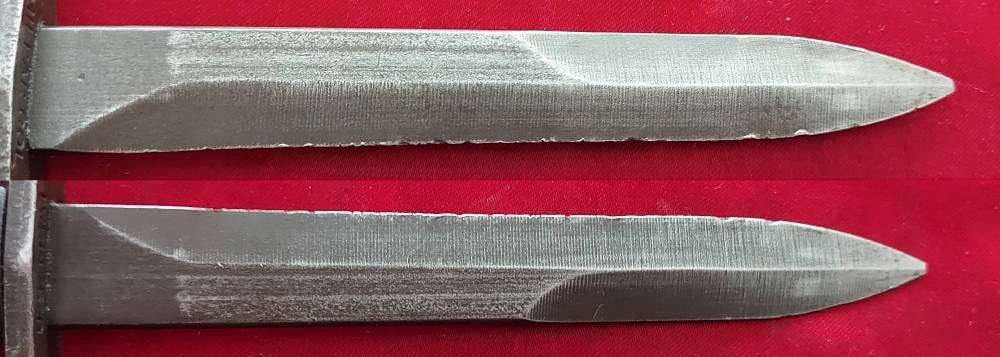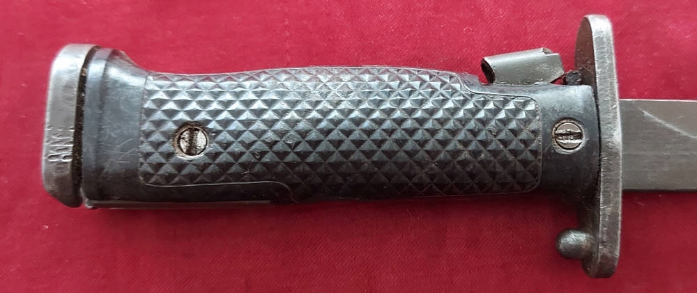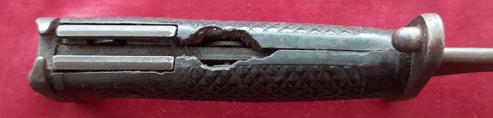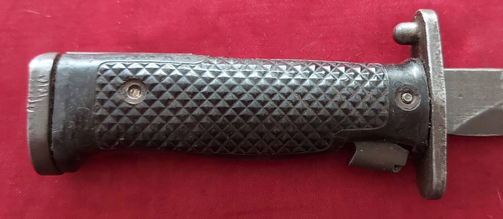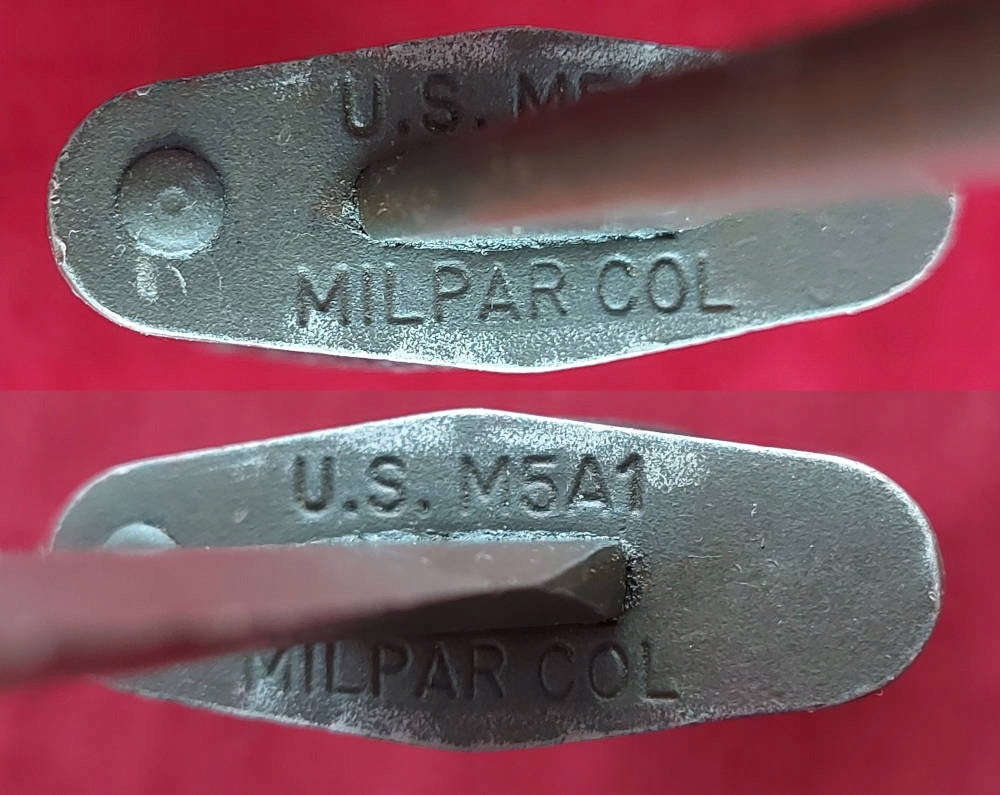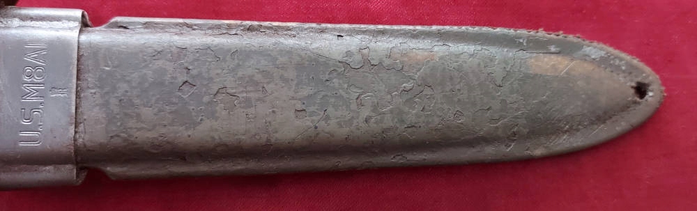 Копія, видна на фотографіях. Лезо розгорнулося, на лезі є оббивка. Обшивка ручки є ебонітом, з видимими пошкодженнями. Замок Bayonet функціональний. На Jelc з голови, підпис США M5a1 і milpar color .