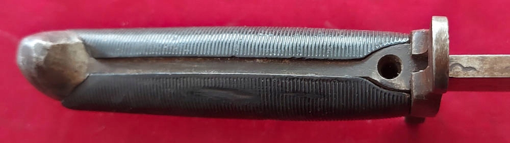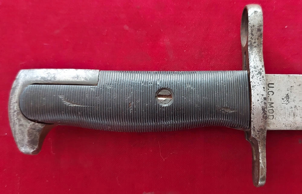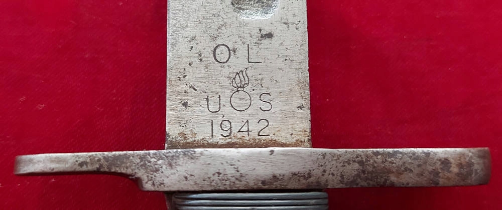 Копія, видна на фотографіях. Добре збережено. Лезо в епоху коротких і загострених. На порізі, в основному, рідко підписуючи обмежені рослини Oneida - букви ol . Нижче наведено вибуховий темно -синій між буквами us та роком виробництва 1942 . З іншого боку, розмитий підпис та U.C. - Мод . Обшивка ручки оригінальна, виготовлена з пластику. Замок Bayonet функціональний.