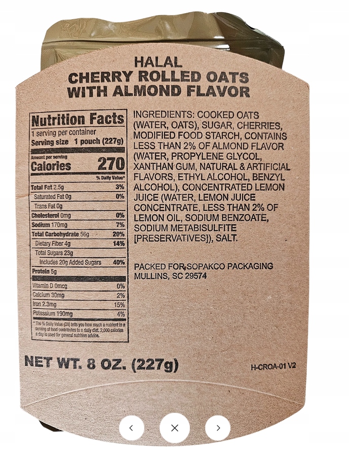 Раціон харчування армії США MRE - це не тільки смачні та поживні страви, а також b>повний набір аксесуарів, який може виявитися безцінним у складних умовах. Залежно від меню до комплекту аксесуарів можуть входити вершки для кави, напій, сіль, жувальна гумка, сірники, цукор, підсолоджувач, змочена серветка, туалетний папір, безполум’яний нагрівач і пластикова ложка. Цеуніверсальний пакет, готовий задовольнити всі ваші харчові та функціональні потреби в польових умовах. Термін придатності до лютого 2033 рокугарантує, що кожен елемент раціону зберігає свою якість, готовий до використання в будь-який час.