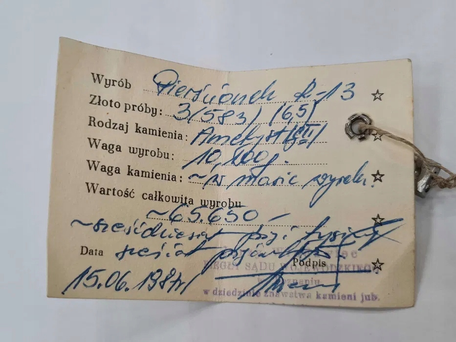 ДОБРО ДЛЯ КОЛЕКЦІОНЕРА - ПЕРСТНЯ З ПЕЧАТКАМИ ВИРОБНИКА ТА СЕРТИФІКАТОМ, ПОВНИЙ ОПИС. Каблучка була продана в художній майстерні в Познані в 1987 році! Іншим цікавим фактом є описана продажна вартість продукту - розрахована відповідно до рівня цін на той час (середня зарплата в 1987 році становила ~~ 30 000 злотих).
