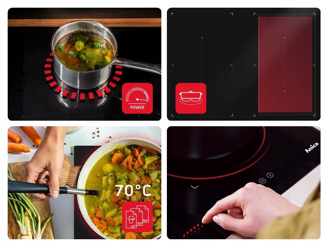 Навіщо експериментувати з температурою нагрівання, витрачати час і ризикувати, що їжа закипить або підгорить? Індукційні плити Amica оснащені рішенням, яке дозволяє швидко встановити температуру відповідно до ваших поточних потреб. 42 ⁰C – ідеальна температура для розтоплення вершкового масла чи шоколаду. Ви можете розігрівати суп і соуси до 70 ⁰C. Ви можете варити макарони або рис при 94 ⁰C. Насолоджуйтесь комфортом!