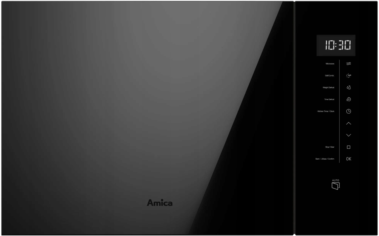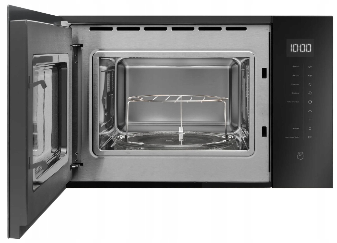 Чорна вбудована мікрохвильова піч об'ємом 25 л, потужністю мікрохвиль 900 Вт і потужністю гриля 1000 Вт.