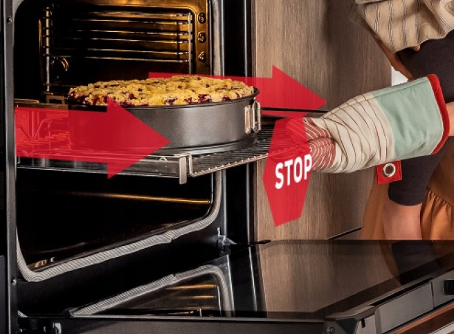 Витягуючи розігріту тацю з гарячою їжею, можна легко обпектися та є ризик впустити тацю. Не в печах Amica! Все завдяки гідам. Завдяки їм ви можете повністю безпечно вставляти та витягувати навіть гарячу та сильно завантажену тацю, не ризикуючи отримати опіки.