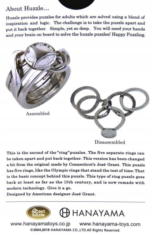 Завдання: Розберіть і знову з'єднайте п'ять окремих кілець, які можна розібрати, а потім знову скласти. Ця версія головоломки була дещо змінена порівняно з оригіналом, зробленим Хосе Грантом із Коннектикуту. Схожість із п’ятьма олімпійськими кільцями, які витримали випробування часом, є цілком навмисною і є основною концепцією дизайну. Цей тип кільцевої головоломки бере свій початок принаймні з 15-го століття та виготовляється досі.