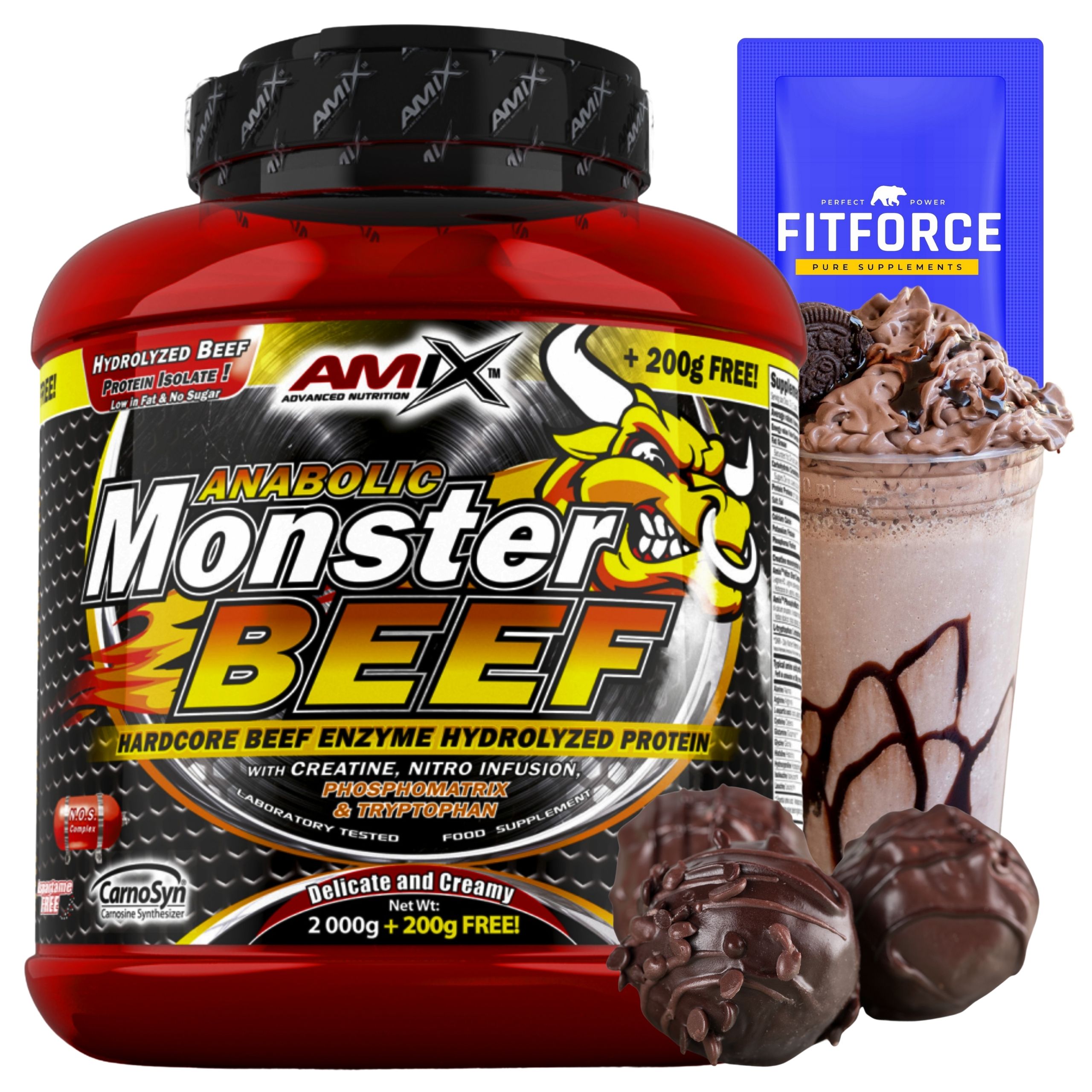 Анаболічний білок з яловичого монстра , - це продукт, який у 90% складається з яловичого альбуміну, який в даний час є найвищим джерелом якості білка на ринку. Завдяки гідролізу час травлення білка набагато коротший. Яловичина -монстр також збагачується креатиновим моногідратом, тим самим збільшуючи енергетичний потенціал, енергію, регенерацію та збільшення м’язової маси. Monster Beef також містить комплекс Nitro Shot, завдяки якому всі необхідні інгредієнти будуть швидко доставлені до м’язових волокон. Крім того, цей продукт містить Phoshomatrix, що забезпечує доставку всіх необхідних мінералів, які відіграють ключову роль у тілі кожного спортсмена.