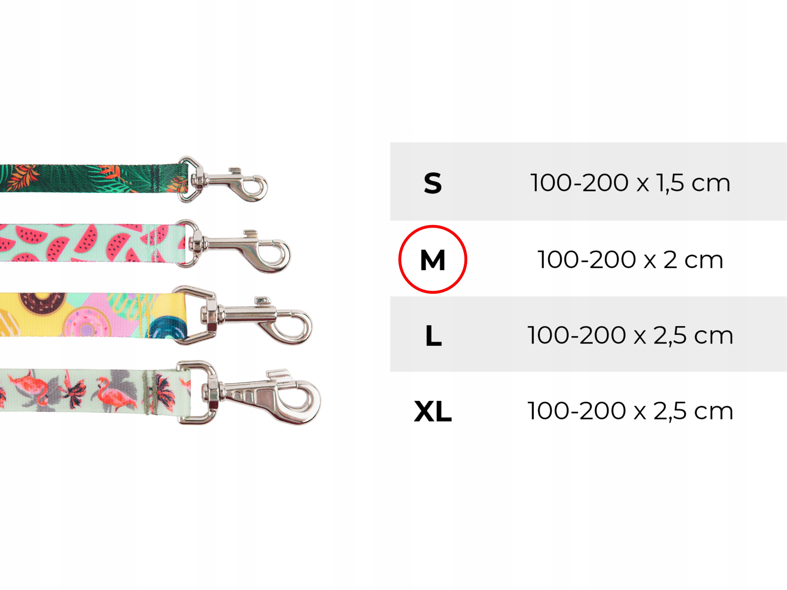 Знімний повідець amiplay 7 в 1 BeHappy — ідеальний вибір для щоденних прогулянок з вашою собакою. Завдяки швидкій зміні довжини ідеально підходить, якщо ви хочете забезпечити собаці необхідну кількість вправ, забезпечуючи її безпеку та ваш комфорт. Вибираючи розмір повідка, враховуйте розмір і темперамент собаки - чим більше і енергійніше собака, тим більший розмір слід вибирати. Розміри відрізняються розміром карабіна та шириною ремінця, як на малюнку вище. Вибираючи розмір, також враховуйте розмір люверсу в нашийнику або шлейці. Переконайтеся, що занадто великий карабін не турбує маленьку собаку.