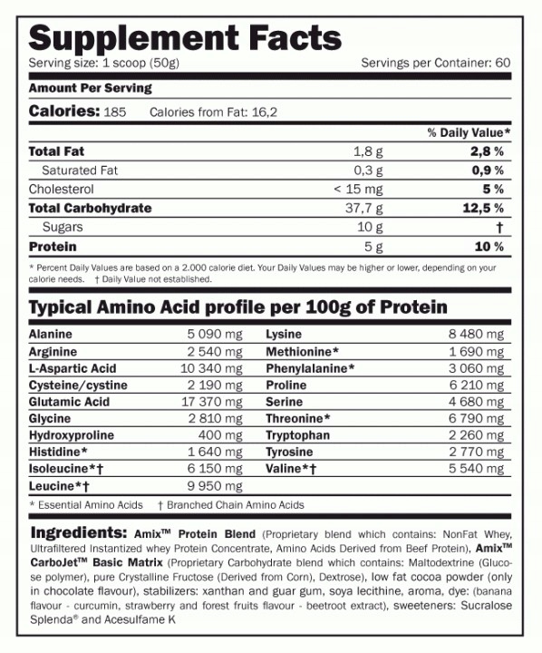 Інгредієнти: Amix™ Protein Blend (запатентована суміш, яка містить: знежирену сироватку, ультрафільтрований швидкорозчинний концентрат сироваткового протеїну, амінокислоти, отримані з яловичого білка), Amix™ CarboJet™ Basic Matrix (запатентована суміш вуглеводів, яка містить: мальтодекстрин (полімер глюкози), чисту кристалічну фруктозу /отриману з кукурудзи/, декстрозу), какао-порошок з низьким вмістом жиру (тільки зі смаком шоколаду), стабілізатори: ксантан і гуарова камедь, соєвий лецитин, ароматизатор, барвник: (аромат банана - куркумін) , ароматизатор полуниці та лісових фруктів - екстракт буряка), підсолоджувачі: сукралоза Спленда® та ацесульфам К