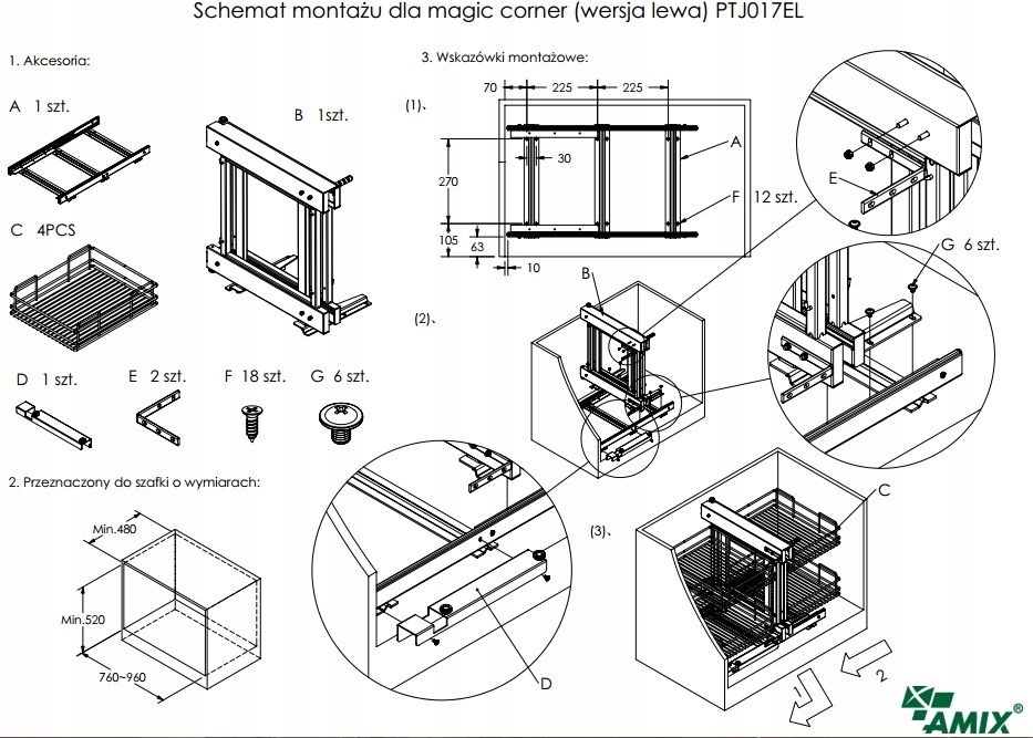 ЧАРІВНИЙ КУТОВИЙ КОШИК AMIXPTJ017EL ЛІВИЙ З ПОВНОЮ ФУНКЦІЄЮ КОСУВАННЯ