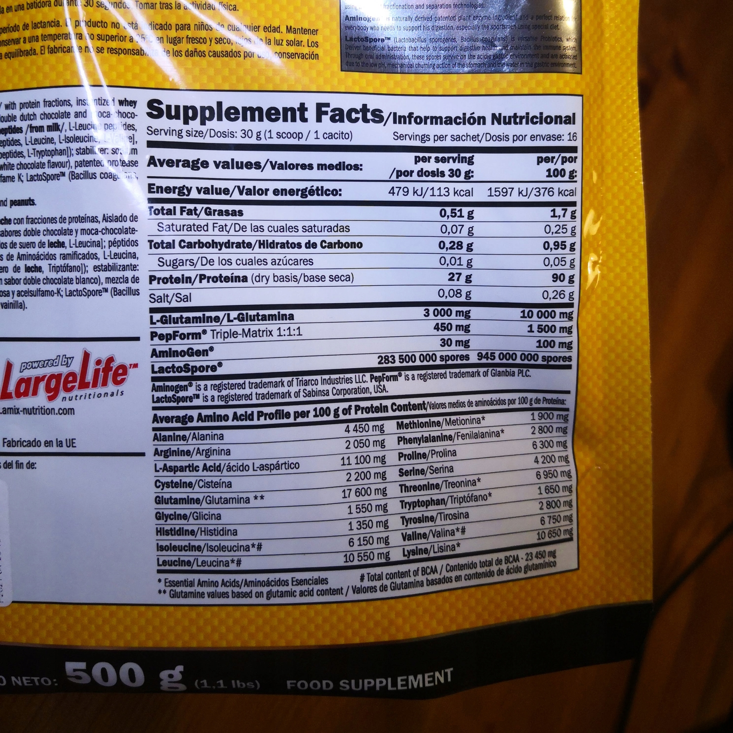 Інгредієнти: ізолят сироваткового білка швидкого приготування CFM® / з молока / з білковими фракціями (бета-лактоглобулін, альфа-лактоглобулін, сироватковий альбумін, імуноглобулін, глікомакропептид, лактоферин, лактопероксидаза), ізольований ізолят сироваткового білка /з молока/, L-глютамін, какао-порошок (тільки зі смаками шоколаду), PepForm ™ Triple matrix (PepForm®-L-Leucine peptides [сироваткові пептиди /з молока/, L-лейцин пептиди, L-лейцин], PepForm® -BCAA [сироваткові пептиди / з молока /, BCAA пептиди, L-лейцин, L-ізолейцин, L-валін], Pep-Form®-триптофанові пептиди [сироваткові пептиди / з молока /, L-триптофанові пептиди, L-триптофан] ); аромат, колір: куркумін (тільки для смаку ванільного молока); стабілізатор: гуарова камедь; емульгатор: соєвий лецитин; натрію хлорид, запатентована білкова суміш AminoGen® (мальтодекстрин, протеаза), підсолоджувачі: сукралоза та ацесульфам К; LactoSpore ™ (Bacillus coagulans, мальтодекстрин).