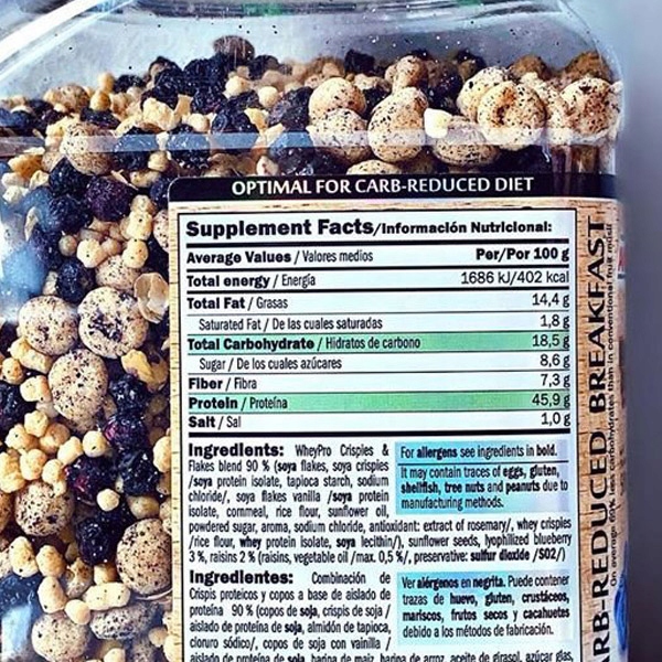 Інгредієнти (полуниця, ваніль) WheyPro Crispies і пластівці 90% суміш (соєві пластівці, соєві Crispies / соєвий b> білковий ізолят, крохмаль тапіоки, натрій / хлорид натрію, соєві ванільні пластівці / соєвий білковий ізолят, кукурудзяне борошно, рисове борошно, соняшникова олія, цукор, ароматизатор, хлорид натрію, антиоксидант: екстракт розмарину /, whey Crispies / рисове борошно, сироватковий білковий ізолят, соєвий лецитин /), насіння соняшнику, сублімовані скибочки полуниці 3%, родзинки 2% ( родзинки, олія рослинна / макс. 0,5% (консервант: діоксид сірки (SO2)).