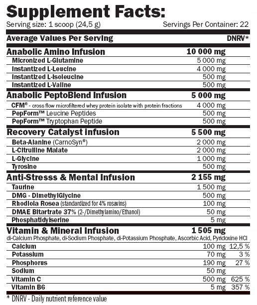 Re-Core® Concetrated Дуже концентрований продукт, що складається лише з найсильніших інгредієнтів для досягнення максимальних результатів. Re-Core® був спеціально розроблений для скорочення часу відновлення після тренування. Цей унікальний продукт знижує вироблення молочної кислоти в м'язах, що значно впливає на їх зростання. Re-Core® забезпечує дуже високу концентрацію BCAA у співвідношенні 8:1:1 для лейцину, який, як відомо, є найбільш анаболічною амінокислотою.
