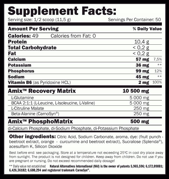 Amix™ Recovery Max™ – це продукт, створений для прискорення регенерації після важких фізичних навантажень. Протягом години після завершення тренування ваші м’язи повинні бути наповнені відповідними поживними речовинами для повного відновлення. Recovery Max містить L-глутамін, незамінну амінокислоту, відповідальну за регенерацію та ріст м’язів, і BCAA, що підвищує синтез білка.