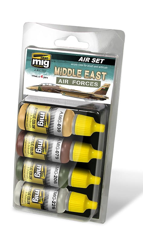 Набір з 4 акрилових фарб по 17 мл, рекомендованих для фарбування сучасних літаків таких країн, як Іран, Ірак, Йорданія та ін. Підходить для пензля та аерографа. Вміст набору: A.MIG-0030 піщано-жовтий, A.MIG-0079 глиняно-коричневий, A.MIG-0206 RLM 81 - FS 34079 - BS641, A.MIG-0226 FS33622 сірий