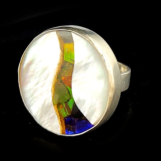 Феноменально красива каблучка зі срібла 925 проби -перламутр (перламутр) ) інкрустований райдужним амолітом. Розміри комплекту: діаметр 26 мм, розмір прикраси 13, можна збільшити до 16 розміру. Ширина обручки 5 мм. Вага 12 г. Рекомендую, надзвичайно. Упакований в декоративну коробку.