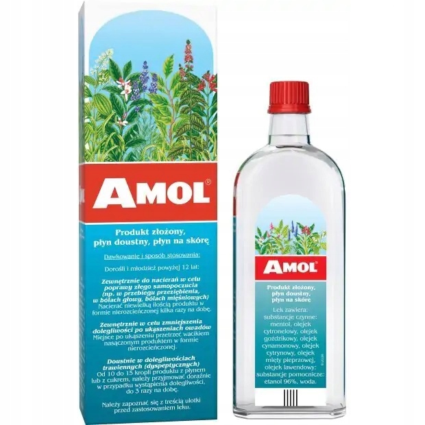 Продукт призначений для традиційного застосування за вказаними показаннями, і його ефективність базується виключно на тривалому використанні та досвіді. Амол традиційно застосовують за наступними показаннями: зовнішньо: для поліпшення самопочуття, наприклад, при застуді, головних болях, м'язових болях; для зменшення симптомів після укусів комах; внутрішньо: при проблемах з травленням (диспептичних захворюваннях), наприклад, при метеоризмі та нетравленні шлунка. Citronellae aetheroleum (цитронеллова олія) 1,00 мг; Caryophylli floris aetheroleum (гвоздикова олія) 1,00 мг; Cinnamomi zeylanici corticis aetheroleum (олія кориці) 2,40 мг; Limonis aetheroleum (лимонна олія) 5,70 мг; Menthae piperitae aetheroleum (олія м'яти перцевої) 2,40 мг; Lavandulae aetheroleum (лавандова олія) 2,40 мг. Допоміжна речовина з відомою дією: етанол (96% об.) 638 мг в 1 г.