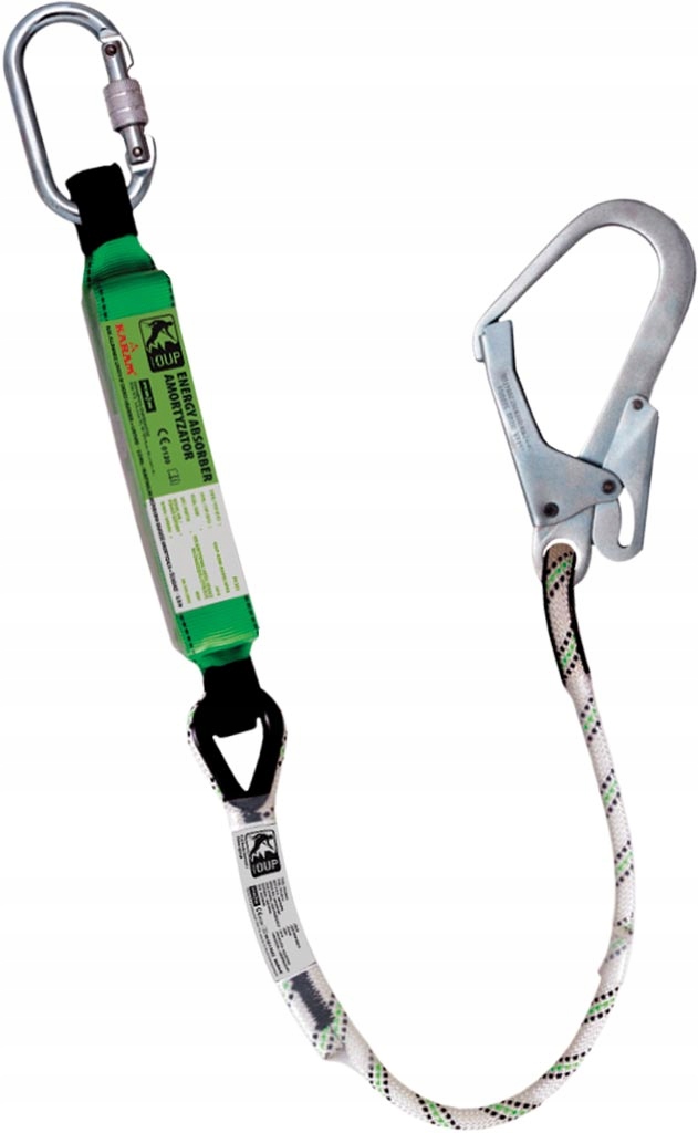 - з одного боку мотузки поглинач енергії з карабіном, з іншого боку сталевий гачок для риштувань