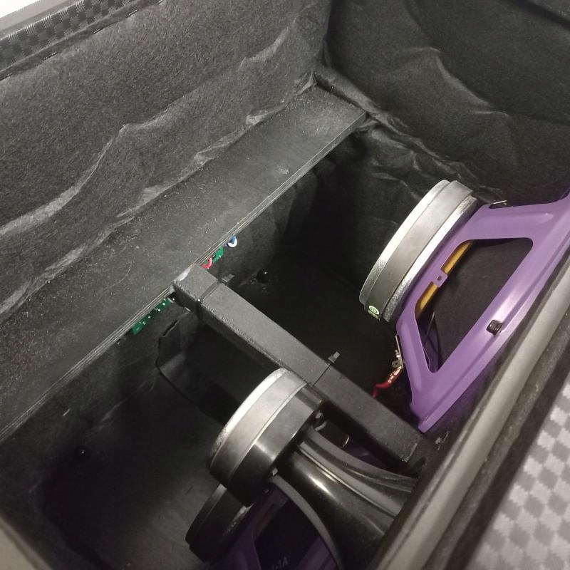 Відкидна конструкція дозволяє встановити підсилювач на верхній стороні корпусу та заховати його всередині колонки для транспортування.