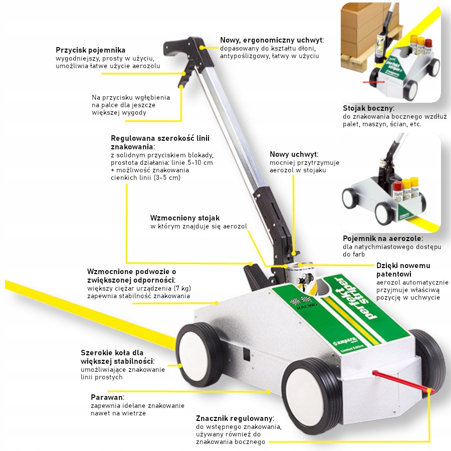 - Бічна підставка полегшує розмітку уздовж піддони, машини, стіни, бордюри тощо