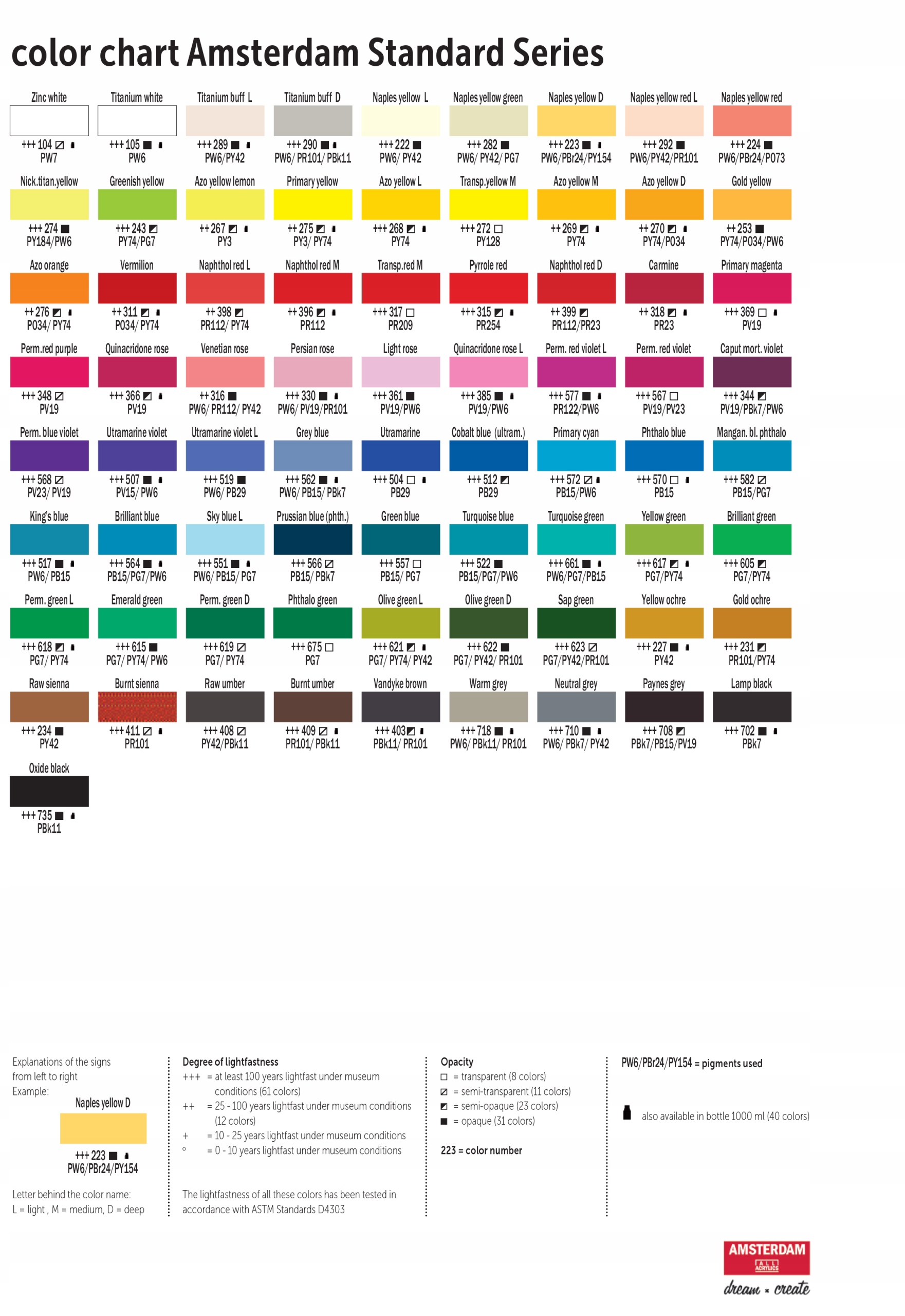 Фарби стандартної серії Amsterdam пропонують усе, що потрібно маляру: економічну, високоякісну фарбу в широкий асортимент понад 80 традиційних і спеціальних кольорів - як непрозорих, так і прозорих. Амстердамські фарби мають дуже високий ступінь світлостійкості завдяки використанню чистих і стійких пігментів. Стійке та еластичне покриття забезпечує найякісніший сполучний, що складається з акрилової смоли. Завдяки стійкості до лугів фарби придатні для фарбування стін.