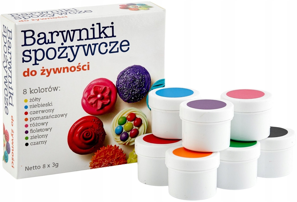 Набір порошкоподібних харчових барвників у багаторазових коробках. Харчові барвники ідеально підходять для фарбування марципанової маси, цукрової пасти, десертів, тортів, морозива, збитих вершків, напоїв, кремів, солодкої вати, великодніх яєць. Порошкоподібні барвники також дозволяють малювати на марципані та глазурі, і все, що вам потрібно зробити, це додати кілька крапель води або спирту.