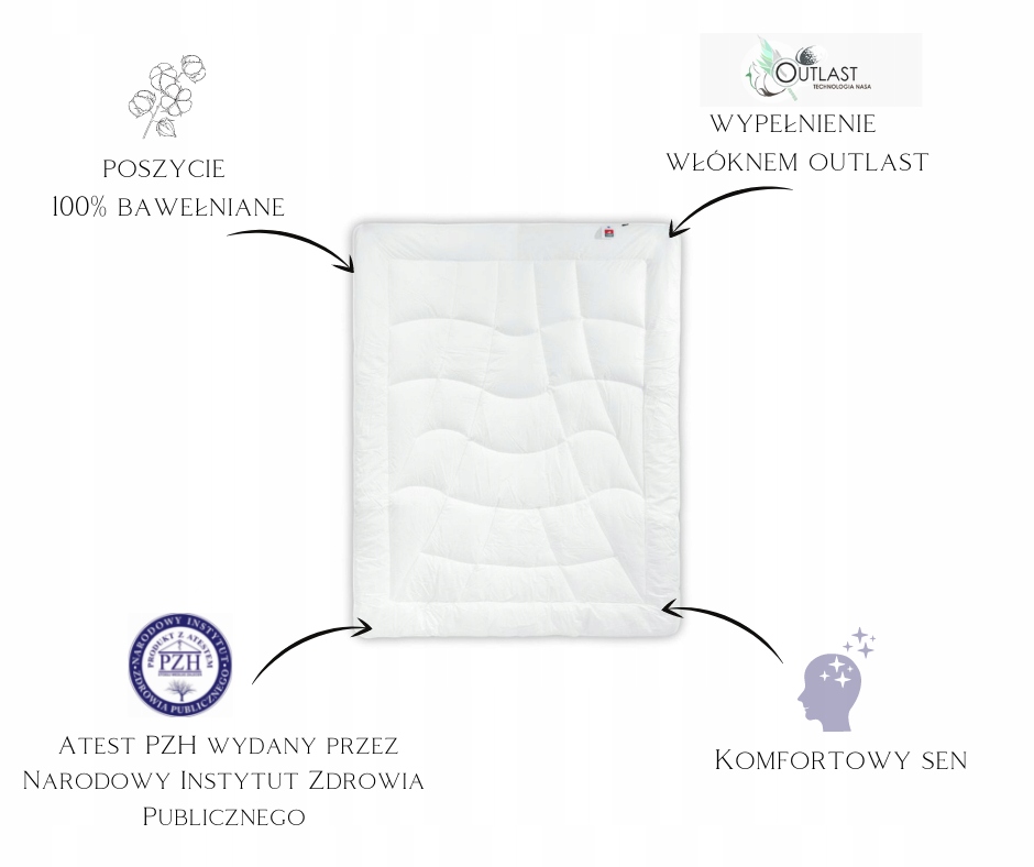 Outlast -це розширене волокно, створене NASA - для потреб простору комбінезони. Основна особливість волокна - це оптимізація температури тіла під час сну. 4 Залежно від потреб, гранули можуть нагріватися, охолонути або залишатися нейтральними. Outlast Fabric створює корисний мікроклімат, завдяки якому запобігає перегріву та натискання під час сну. 4 Продукт безпечний для хворих на алергію , гарантує гігієну та чистоту на найвищому рівні.