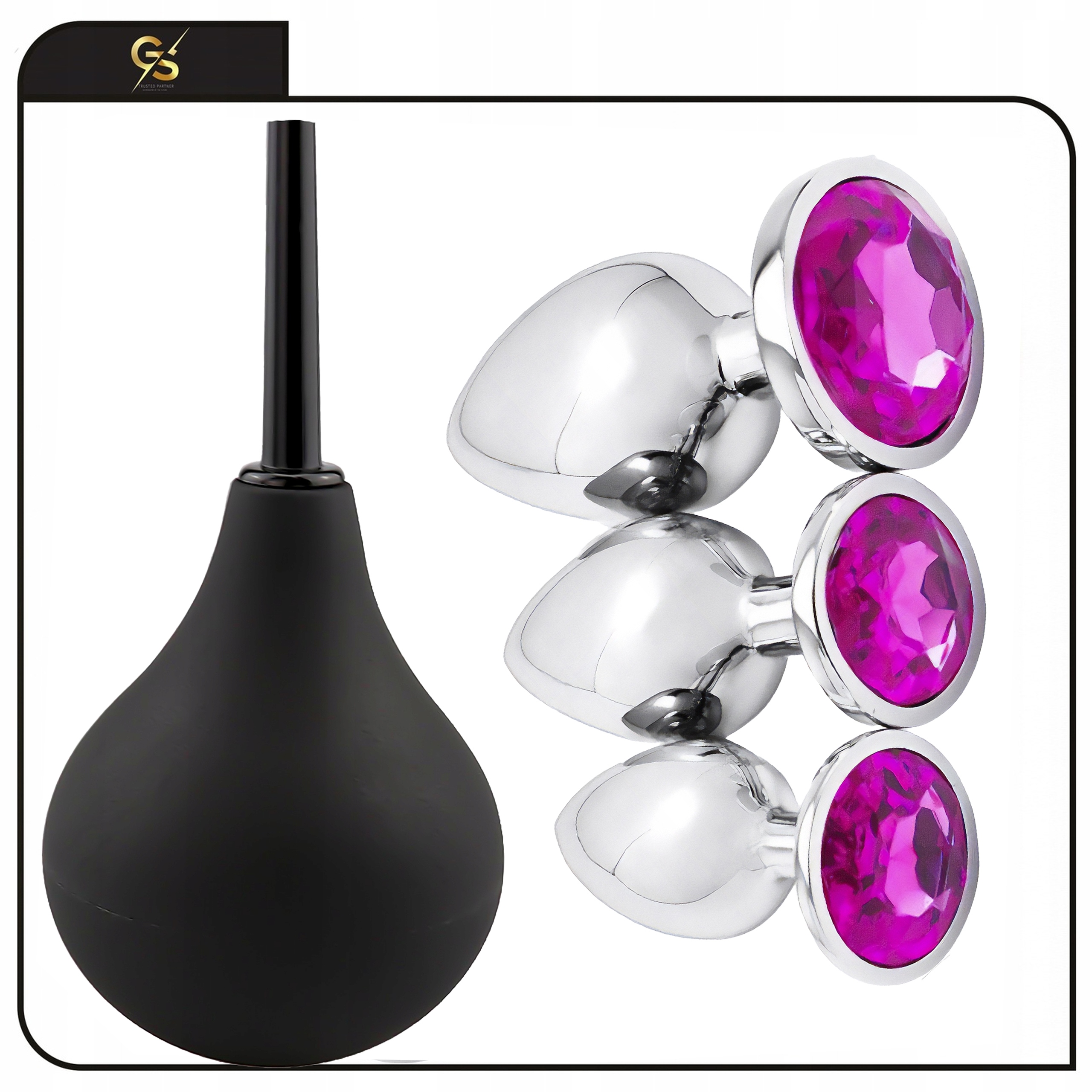 Подбайте про гігієну та задоволення на найвищому рівні завдяки повному набору для анального використання. Набір включає професійну анальну пробку ємністю 224 мл та набір із 3 анальних пробок із нержавіючої сталі розмірів S, M та L. Все зроблено з безпечних, міцних матеріалів і розроблено з урахуванням комфорту, функціональності та естетики.
