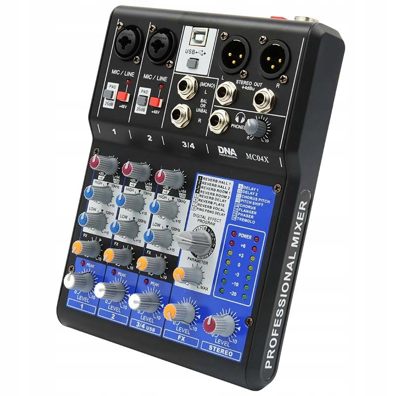 DNA MC04X - це 4-канальний аналоговий аудіомікшер серії MC від DNA. Консоль оснащена 4 лінійними входами (2 моно і 1 стерео), 2 балансними XLR виходами з висококласними попередніми підсилювачами, портом USB, фантомним джерелом живлення +48V b> (окремо для кожного каналу!) і розширений процесор ефектів (DSP).