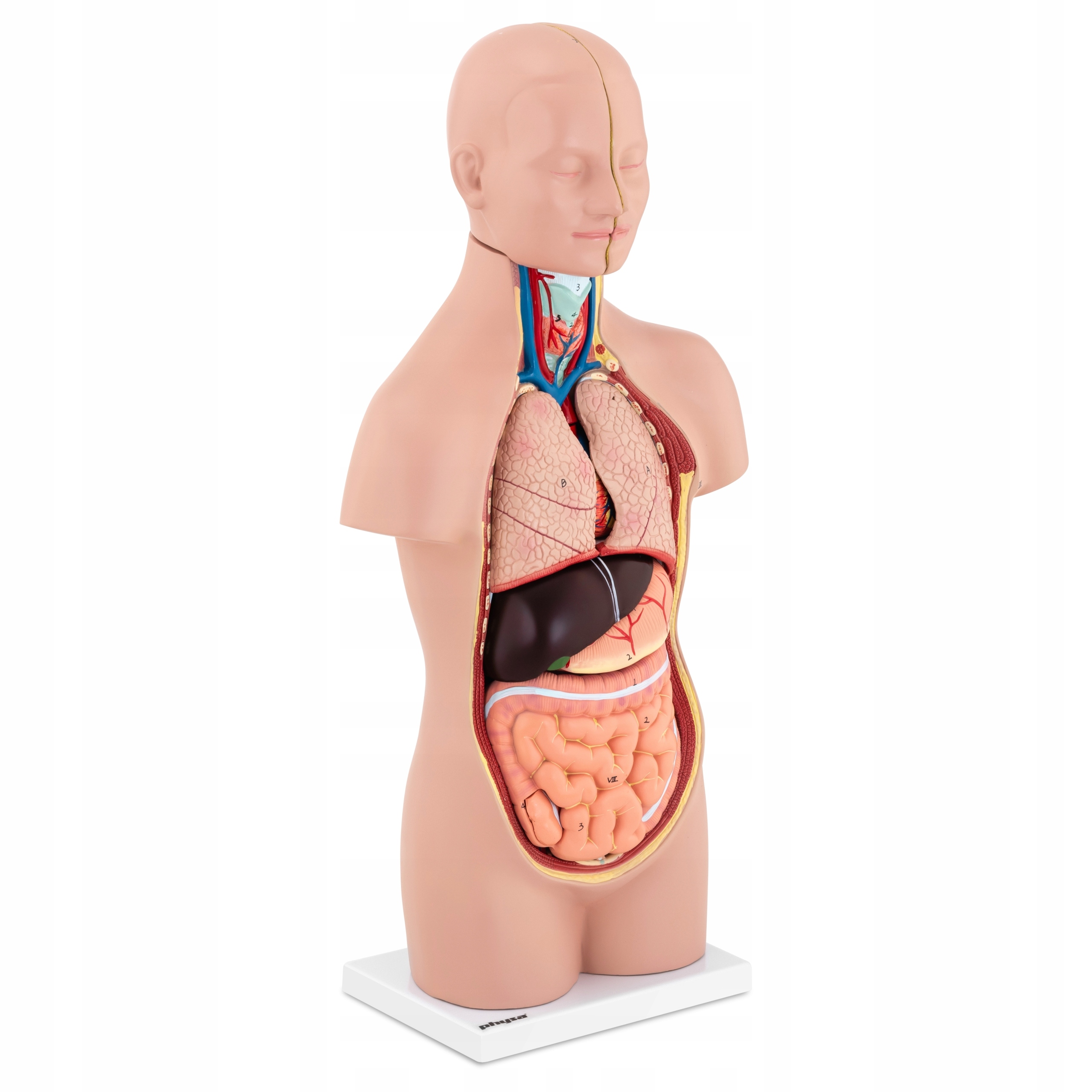 Анатомічна модель людського тіла - це чудова допомога в навчанні, коли вивчає те, як будувати людський організм. Ідеально помітні органи значно полегшують навчання в навчанні. Репліка представляє легені, серце, шлунок, печінку, нирки, кишечник тощо. Окремі елементи можна намалювати і ретельно переглядати з кожного боку. 3D -модель відрізняється високим реалізмом. Модель, виготовлена з пластику ПВХ .