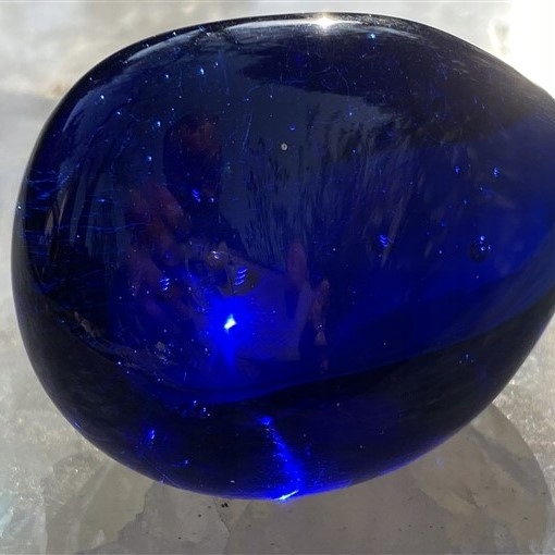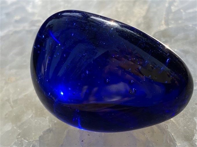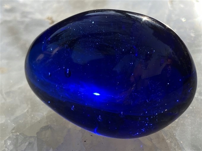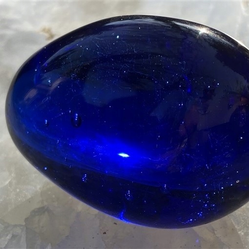 "прискорює духовний розвиток. Він автоматично очищає і гармонізує всі чакри. Він розширює свідомість. Це канал для чистого синього променя. Він містить енергію високої Священики та священики. . Залишившись у тіні, це виглядає темно. Кристали можуть відбуватися після полірування бульбашок повітря у вигляді білого міні -"геода" на поверхні