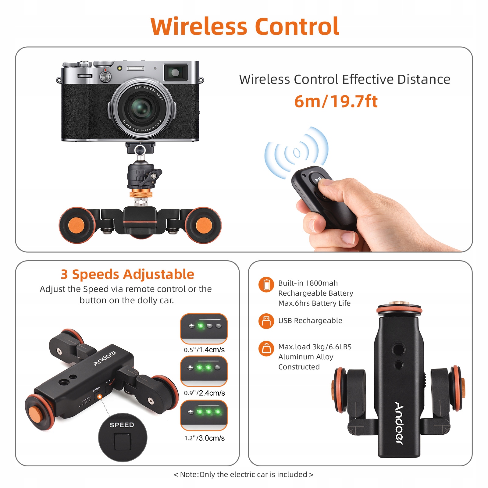 1. 3 Регульовані швидкості: моторизована камера Dolly з вказівкою шкали підтримує 3 рівні регульованої швидкості (1,4 см/с, 2,4 см/с, 3,0 см/с), ультра низький шум і стійкий рух.