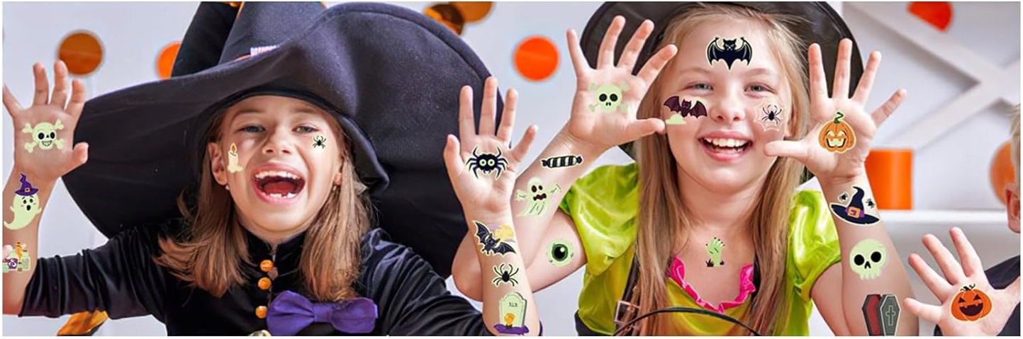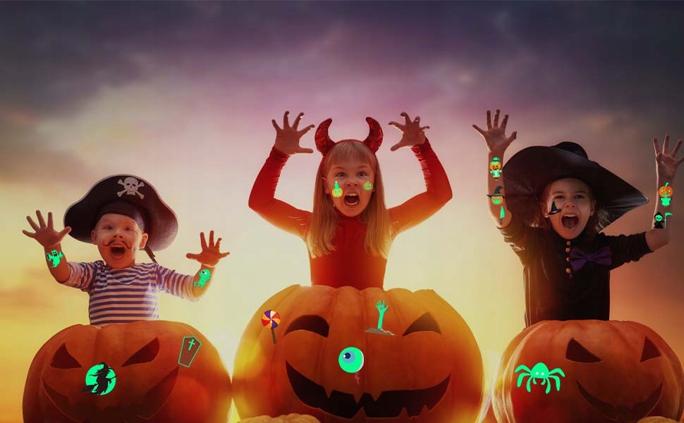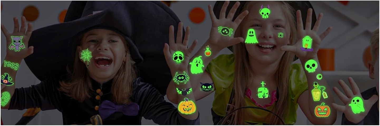 Татуювання ідеально підходять для прикраси тіла під час Хелловіну, а також можуть використовувати як невеликі подарунки для гостей. Здивуйте своїх друзів оригінальними татуюваннями, які світяться після настання темряви та створюють моторошну атмосферу!