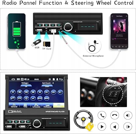 Автомагнітола 1 DIN: 188 (Д) x 58 (В) x 154 (Ш) мм, 7-дюймовий автомобільний радіоприймач із ємнісним сенсорним дисплеєм зі складаним слотом USB/Aux-In/SD. Cinch вихід/вхід, можна підключити до DVR. Можливість встановити 7 кольорів підсвічування кнопок. Перед покупкою перевірте, чи цей пристрій сумісний із вашим автомобілем, вимірявши розмір екрана, розмір установки та роз’єм джгута проводів. Після відправлення ми надішлемо посібник користувача у форматі PDF. Перед установкою прочитайте тест. Цей пристрій не працює під управлінням Android і тому не підтримує Wi-Fi, завантаження програм, GPS тощо.