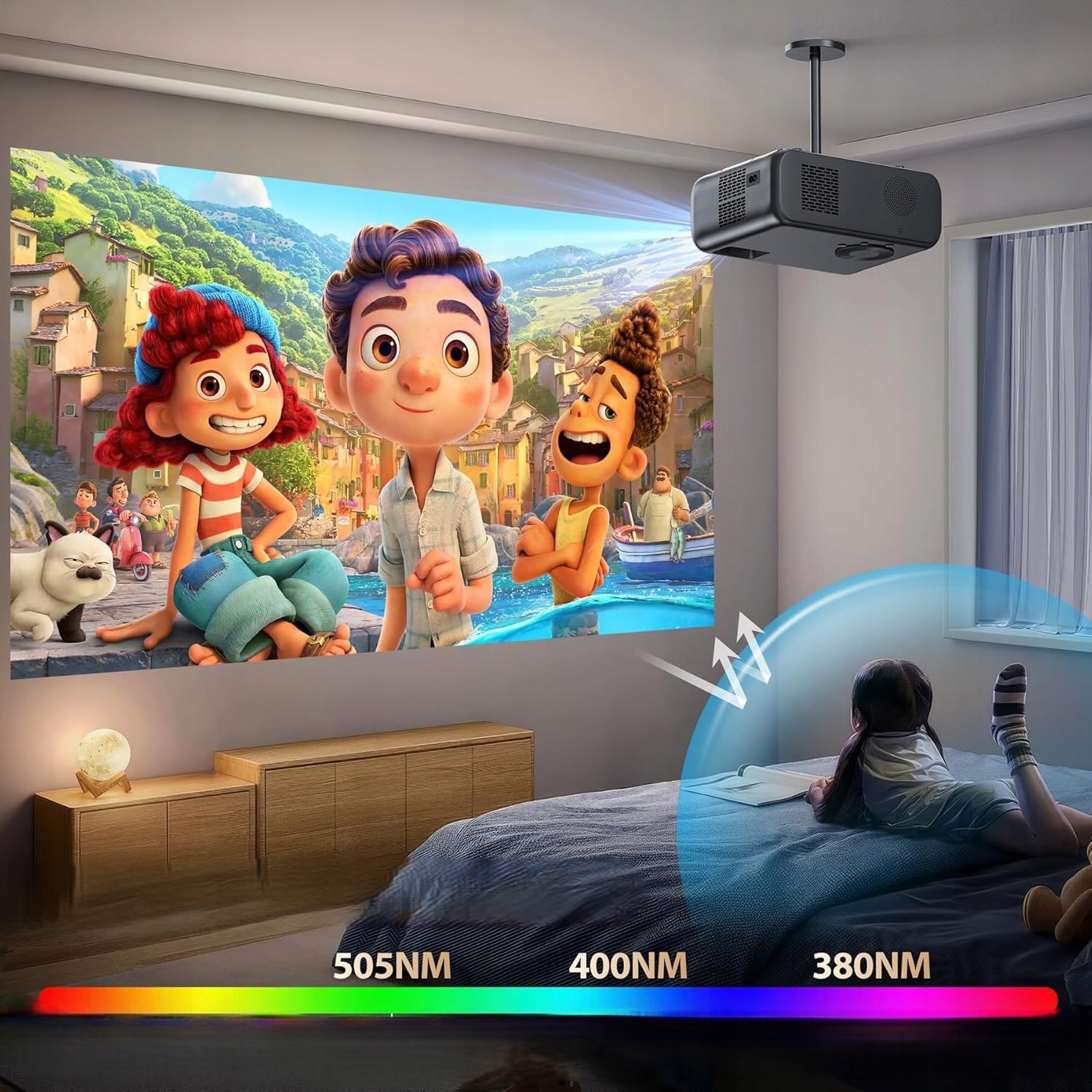 - Проектор використовує технологію зменшення синього світла, яка зменшує втому очей.