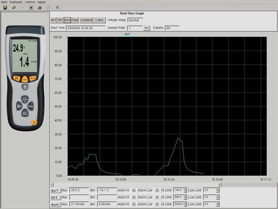 Пристрій має знімний вентилятор-зонд для вимірювання параметрів повітряного потоку, бездротове (PIR) вимірювання температури поверхні, лазер для точного вимірювання температури поверхні та функції пам’яті для останнього, мінімального, максимального та середнього показань.