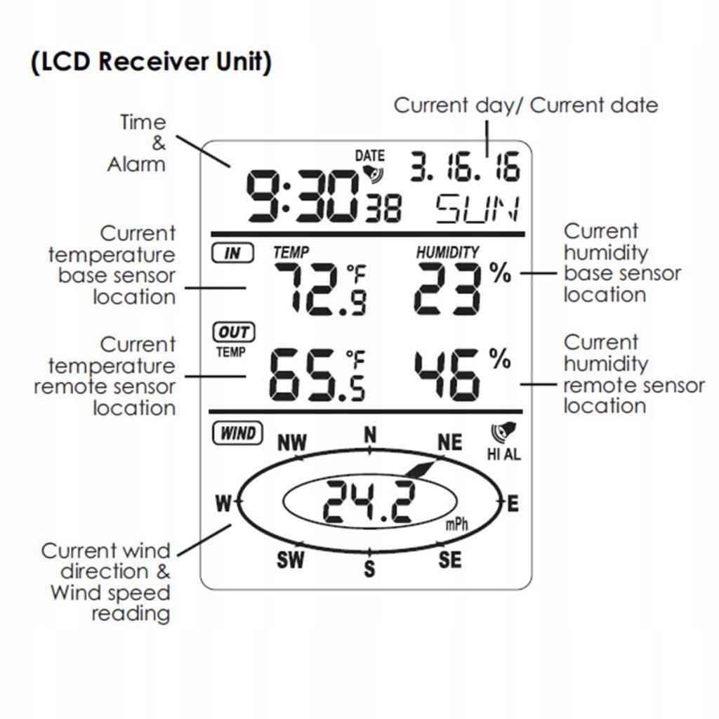 Дисплей: відносна вологість у приміщенні та на вулиці, температура й точка роси, відображення часу в 12- або 24-годинному форматі. Записує змішану/максимальну температуру та вологість у приміщенні та на вулиці.