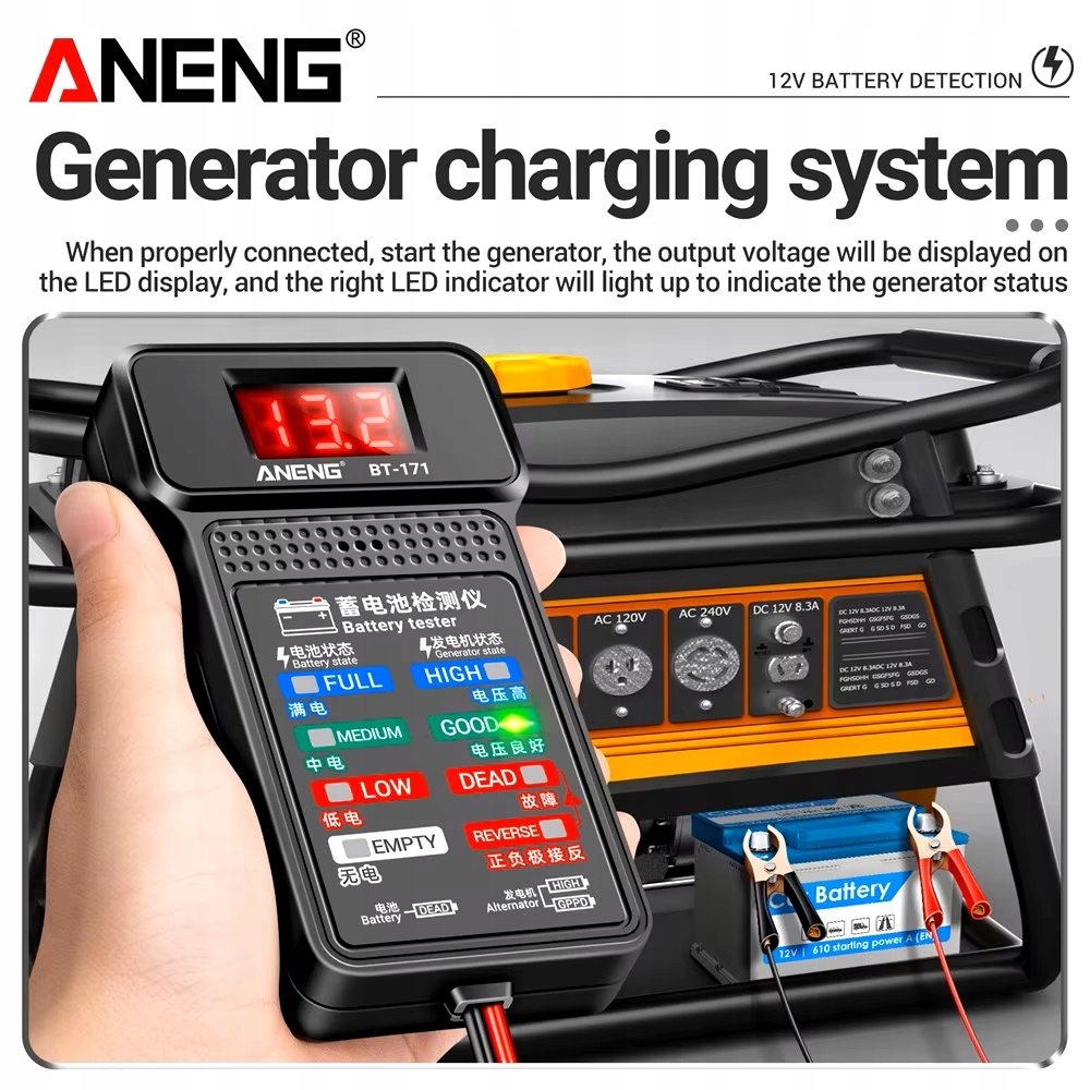 Під час тестування системи заряджання генератора правильно підключіть тестер і клеми акумулятора, потім запустіть генератор, вихідна напруга буде відображатиметься на екрані світлодіодного дисплея, а правий світлодіодний індикатор засвітиться, вказуючи на стан генератора