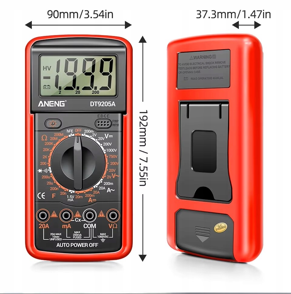 ANENG DT9205A розроблено з урахуванням довговічності та безпеки. Корпус виготовлений з високоякісного ABS пластику і захищає внутрішню частину пристрою від механічних пошкоджень. Вбудований захист від перевантаження захищає як користувача, так і лічильник від пошкоджень.
