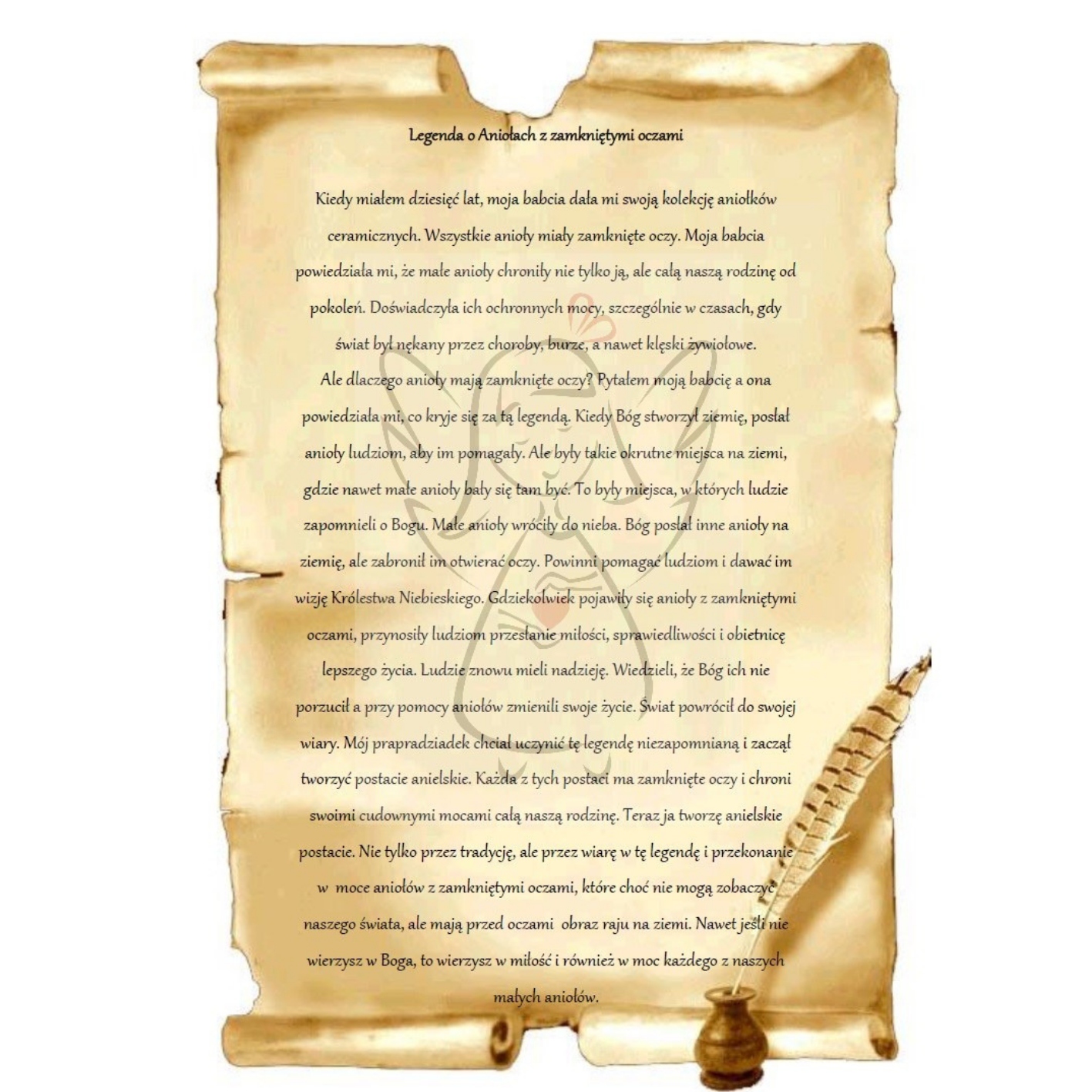 Коли мені було десять, бабуся дала мені свою колекцію керамічних ангелів. Усі ангели мали закриті очі. Бабуся сказала мені, що маленькі ангели не тільки захищали її, але й всю нашу сім'ю поколіннями. Вона пережила їх захисну силу, особливо в той час, коли світ зазнавав утисків захворювань, штормів і навіть стихійних лих. Але чому ангели закриті очі? Я запитала бабусю, і вона сказала мені, що стоїть за цією легендою. Коли Бог створив землю, він послав ангелів людям, щоб допомогти їм. Але на землі були такі жорстокі місця, де навіть маленькі ангели боялися бути там. Це були місця, де люди забули про Бога. Маленькі ангели повернулися на небо. Бог послав інших ангелів на землю, але заборонив їх відкрити очі. Вони повинні допомогти людям і дати їм бачення Царства Небесного. Де б не з’явилися ангели із закритими очима, вони принесли людям послання про любов, справедливість та обіцянку кращого життя. Люди знову сподівалися. Вони знали, що Бог не відмовляється від них і за допомогою ангелів вони змінили своє життя. Світ повернувся до своєї віри. Мій чудовий -нач -грандфатер хотів зробити цю легенду незабутньою і почав створювати ангельські фігури. Кожен з цих персонажів закривав очі і захищає всю нашу сім'ю своїми чудовими силами. Тепер я створюю ангельські персонажі. Не тільки через традицію, але через віру в цю легенду та переконання в силах ангелів із закритими очима, що, хоча вони не можуть побачити наш світ, але мають картину раю на землі. Навіть якщо ви не вірите в Бога, ви вірите в любов, а також в силу кожного з наших маленьких ангелів.