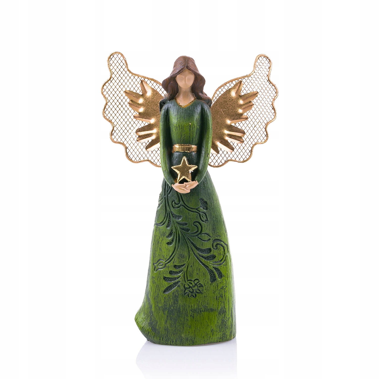 Розписаний вручну ангелу зеленому вбранні, прикрашений рослинним орнаментом. Фігура ангела тримає в руках зірку. Золоті, ажурні крильця з металу надають усьому неповторного шарму. Статуетка стане ідеальним подарунком для близької людини або формою подяки. Завдяки своїм характерним кольорам він стане ідеальною прикрасою, яка підійде до будь-якого інтер'єру.
