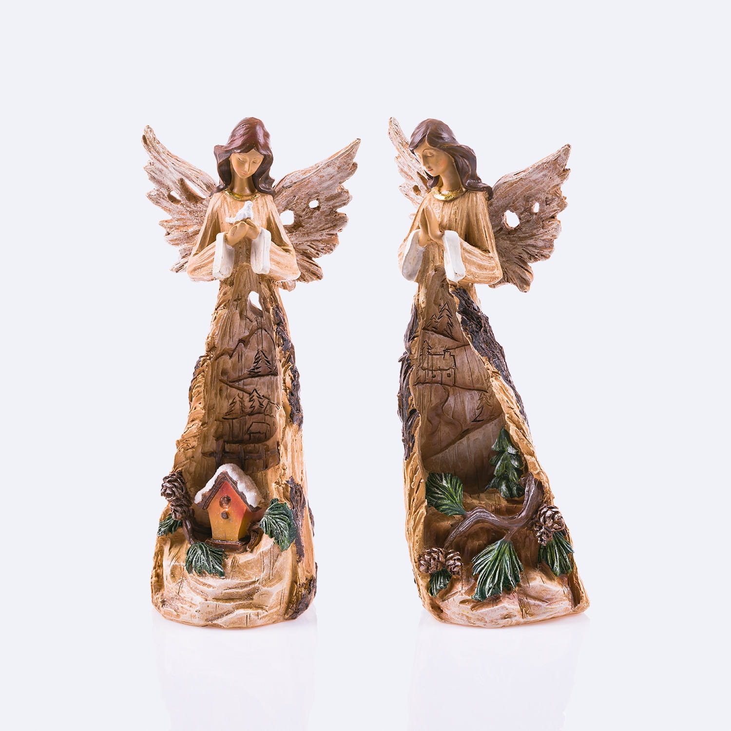 Angel Decorato Ідеальний подарунок для причастя, весілля хрещення прекрасно прикрасить інтер'єр квартири. Ангел у кольорі дерева з різьбленою сукнею з домашнім мотивом, що тримає голуба. Наркотики ангел з різьбленою сукнею з лісовим мотивом, що молиться. Енделі, виготовлені з синтетичної смоли