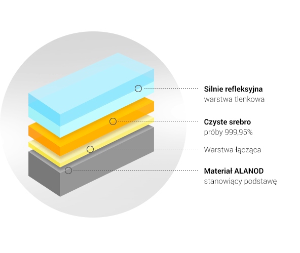 Сучасний технологічний процес PVD (фізичне осадження частинок срібла з газової фази) дозволяє поєднувати шар 999,95% чистого срібла з основний матеріал ALANOD і додаткові покриття, що забезпечують високий ступінь відбиття світла і захищають срібло від окислення.