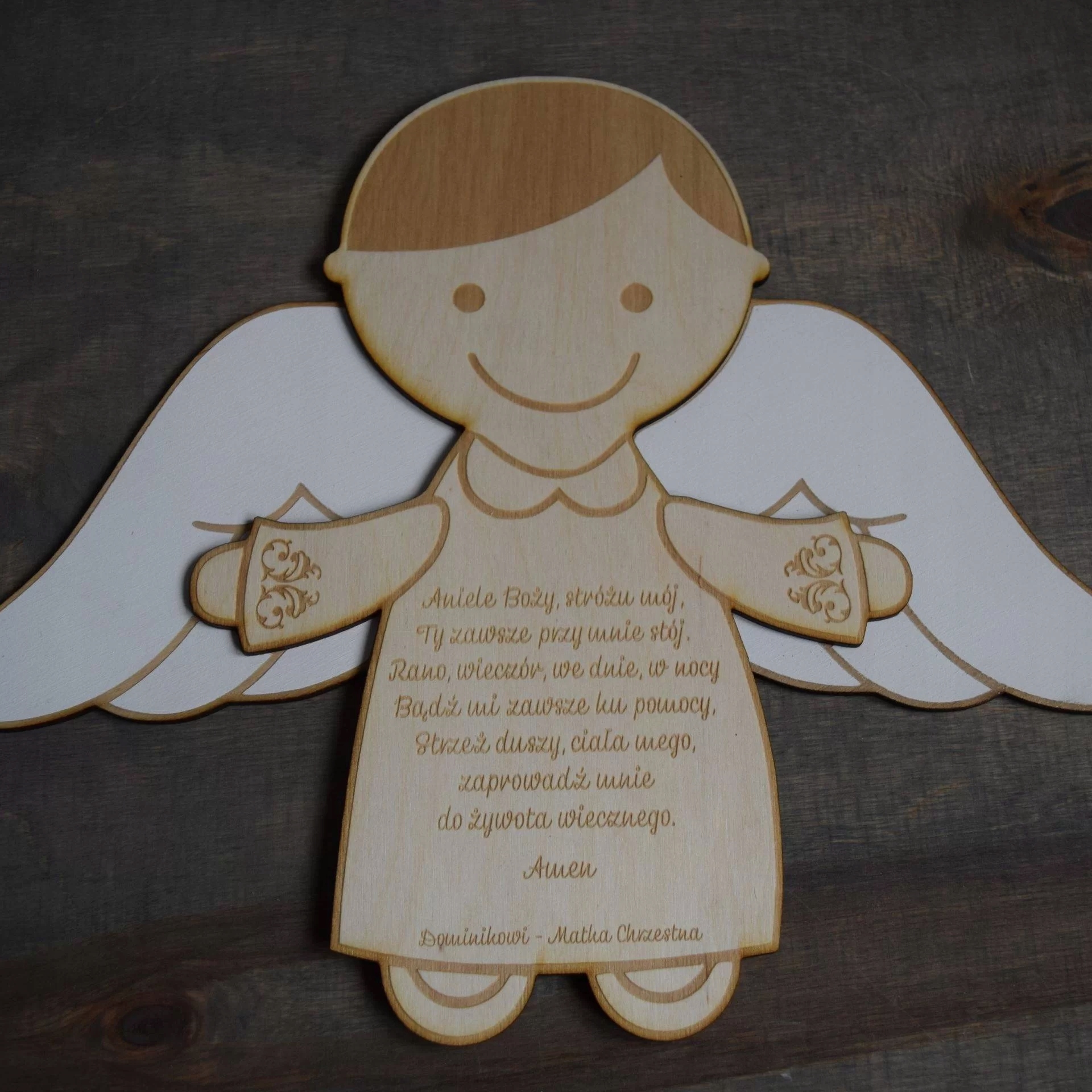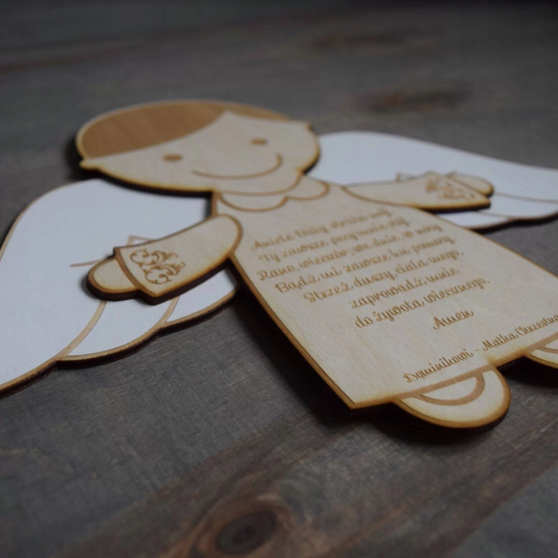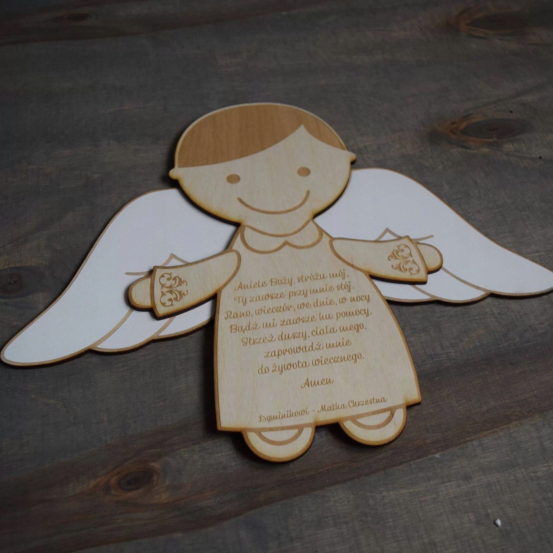 Ангел з молитвою - це ідеальний подарунок для дитини з нагоди його народження, в день його хрещення, а також з нагоди Святого Причастя. Зроблено з природного середовища -доброзичливого матеріалу. Рука -розфарбовані крила.