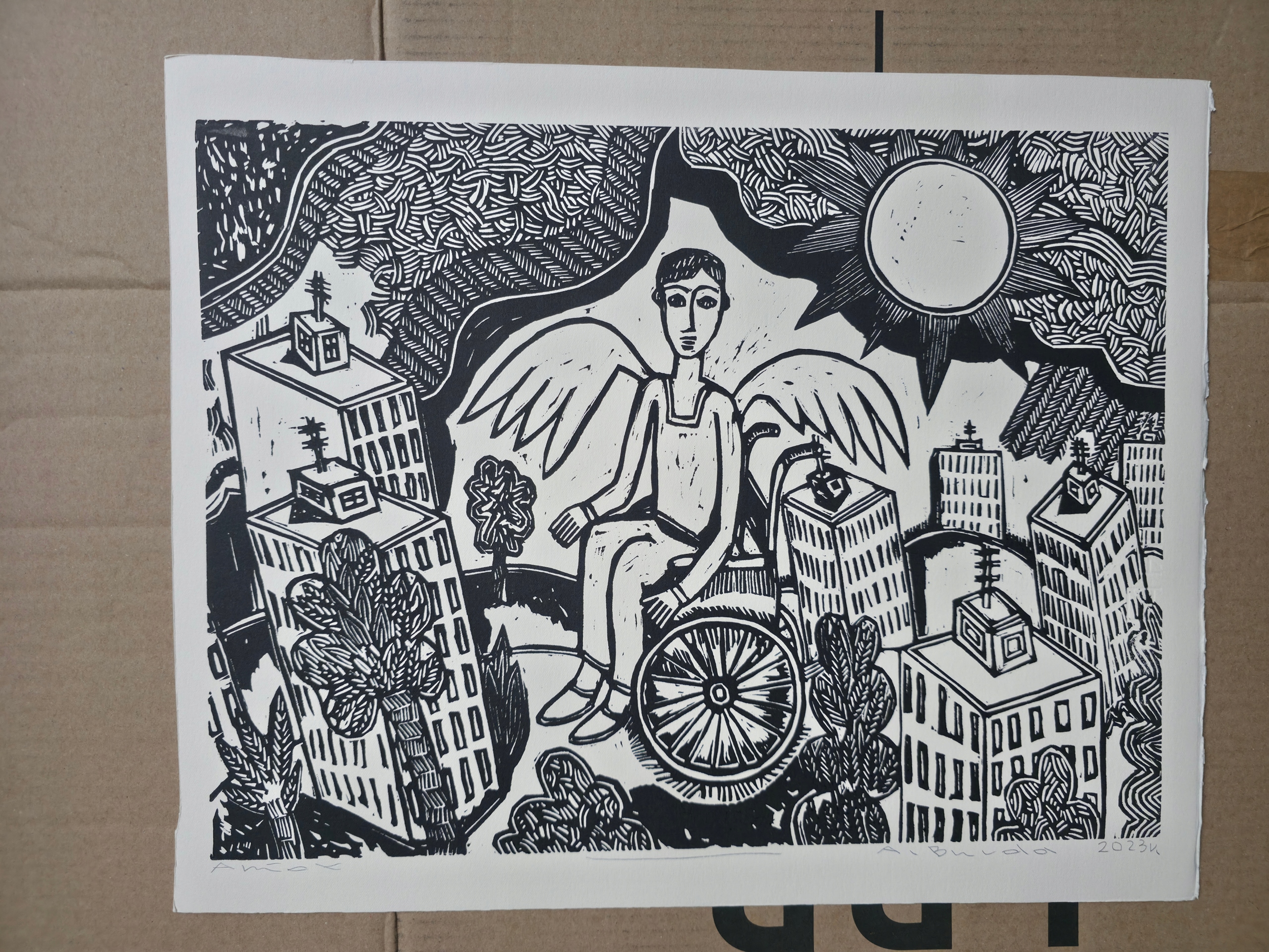 Предметом аукціону є оригінальна художня графіка, виконана мною в техніці ліногравюри, під назвою «Ангел», розмір роботи 40,4 × 30 см, виконана в 2023 році, принт обмежений і підписаний. Більше моїх робіт ви можете побачити https://www.instagram.com/wypuklodruk.na.bruku