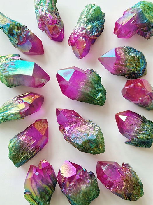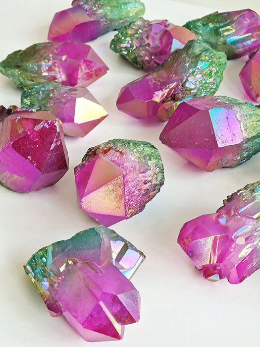 Це природний гірський кристал, який покриває платина та срібло, іноді золото, що дає ефект непрозорої веселки.