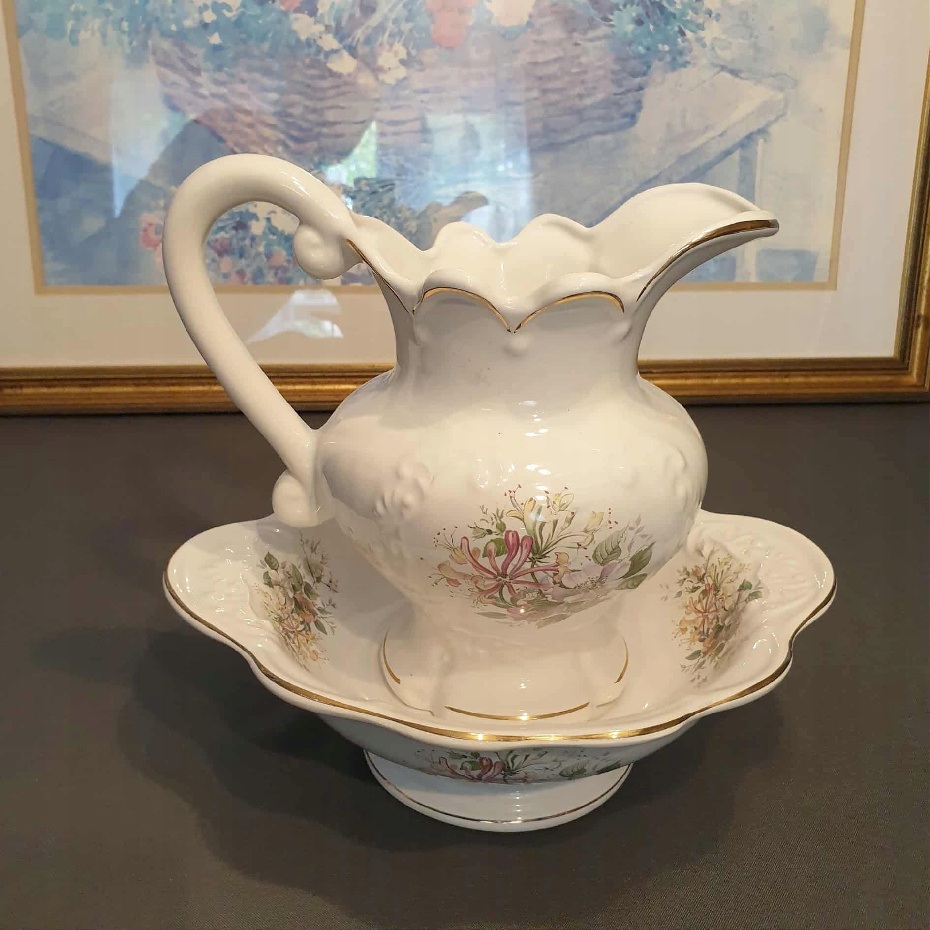 Angielski dzban z misą Made in England – kwiaty, złocenia, vintage